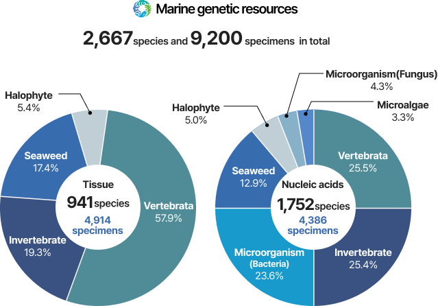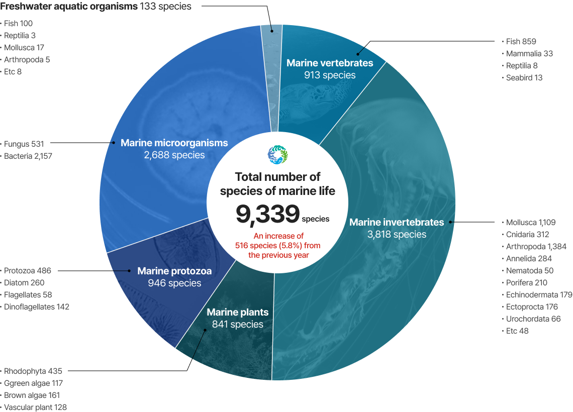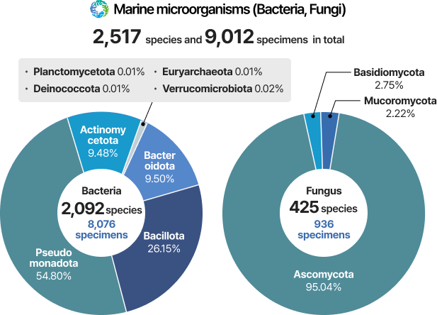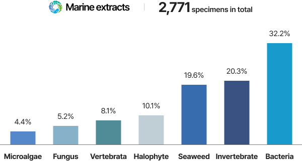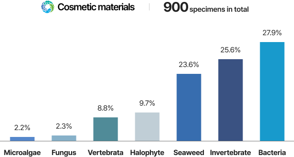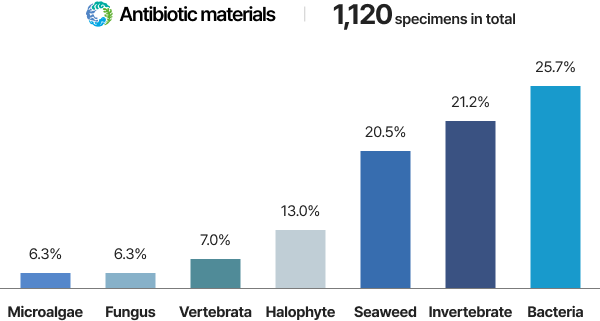 Microalgae:2.2%, Fungus:2.3%, Vertebrata:8.8%, Halophyte:9.7%, Seaweed:23.6%, Invertebrate:25.6%, Bacteria:27.9%