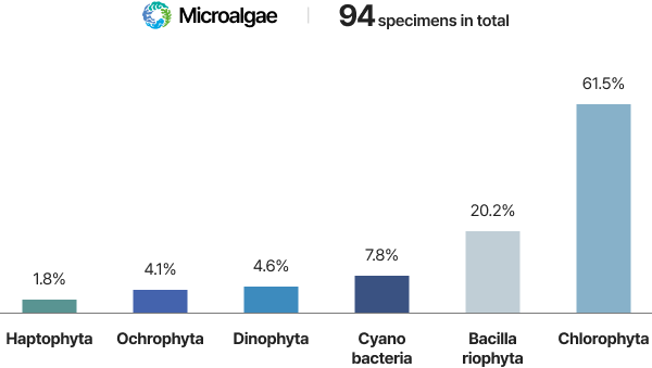 Haptophyta:1.8%, Ochrophyta:4.1%, Dinophyta:4.6%, Cyanobacteria:7.8%, Bacillariophyta:20.2%, Chlorophyta:61.5%